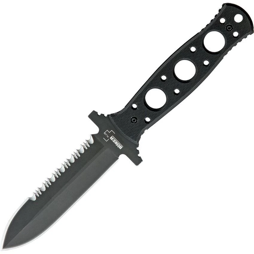 Model – BOP02BO285. Boker 02BO285 – Steelmariner Fixed Blade Knife. 8 5/8″ overall. 4 1/4″ titanium coated 440C stainless double edge blade. Bottom of blade is partially serrated. Full tang. G-10 handles with oval machined cutouts. Molded black Kydex sheath. Made in China.